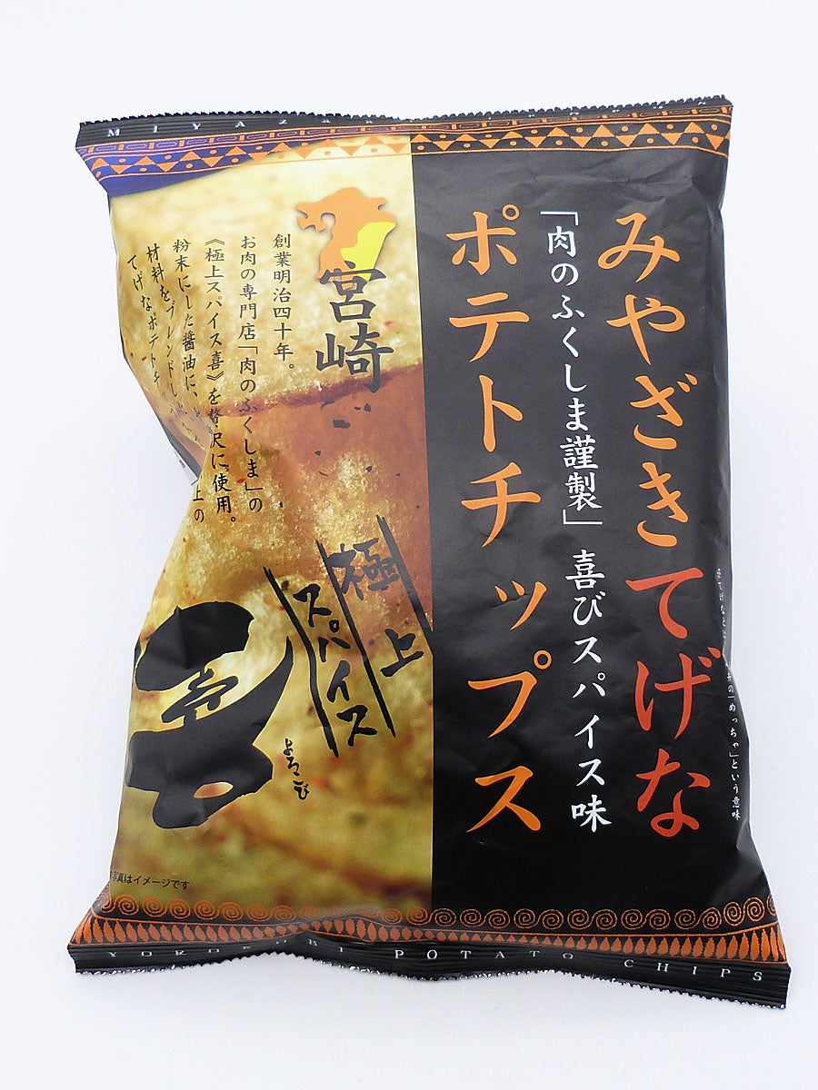 明治40年の創業以来、宮崎県都城市にて愛され、100年以上の歴史を持つ精肉店「肉のふくしま」。同社が開発した「極上スパイス喜(よろこび)」を粉末にした醤油に、約15種類のスパイスを粗挽きブレンドした万能スパイスを贅沢に使用した、ご当地ポテトチップスです。おやつはもちろんのこと、お酒のお供にも最適。「肉のふくしま」全面協力商品です。