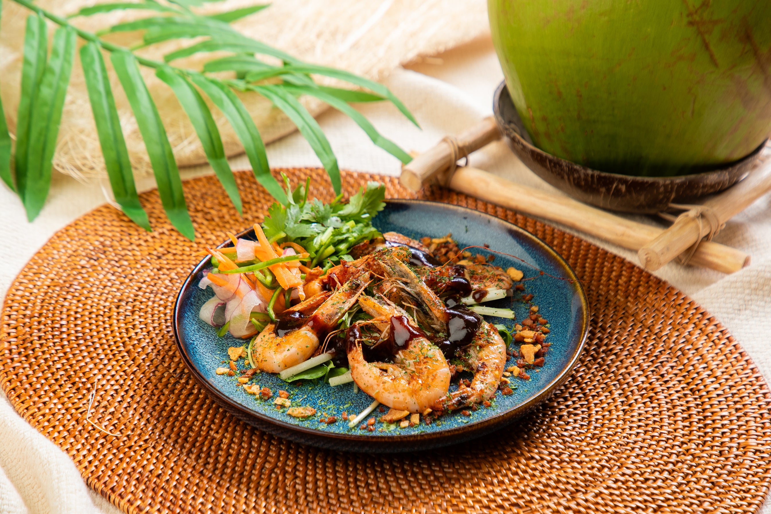 自家製漬けダレに漬けた海老を鉄板で焼き上げ、バターで香り付け!付け合わせにはココナッツ醤油香る彩り野菜を。お酒がすすむおつまみです。