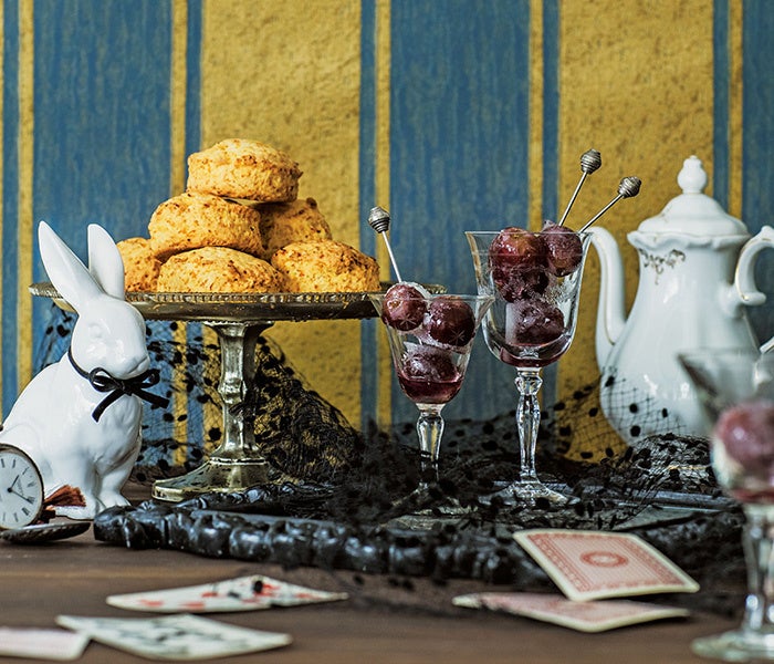 毎月2種、計6種のお菓子が作れるレシピ付き。イギリスの伝統菓子はもちろん、“不思議なきのこのメレンゲ”や“シロップ井戸のキャロットスコーン”などアリスの物語に登場するワンシーンを思い出させる不思議なお菓子も作れるように。アリスになった気分で紅茶とのマリアージュを楽しむことができます。