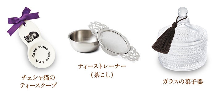 実用的なのに物語への没入感も味わえる3種類のグッズがそろい、おいしい紅茶時間をサポート。〈チェシャ猫デザインのティースクープ〉〈ステンレス製のティーストレーナー(茶こし)〉〈EAT MEケーキが入っていたみたいなガラスの菓子器〉などわくわくするラインナップ。小さなお茶会への「招待状」としても使える大判ポストカードも楽しみのひとつです。
