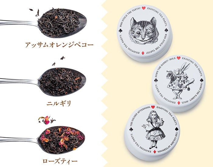 日本に数名しかいない紅茶鑑定士が「紅茶入門として、今お届けしたい茶葉」を厳選。〈アッサムオレンジペコー〉〈ニルギリ〉〈ローズティー〉の3種類をセレクトしました。とっておきの茶葉を使って味わい深い紅茶の時間を実戦的に堪能できます。アリスの世界を身近に感じられる素敵な缶付きで、茶葉の保管も安心。