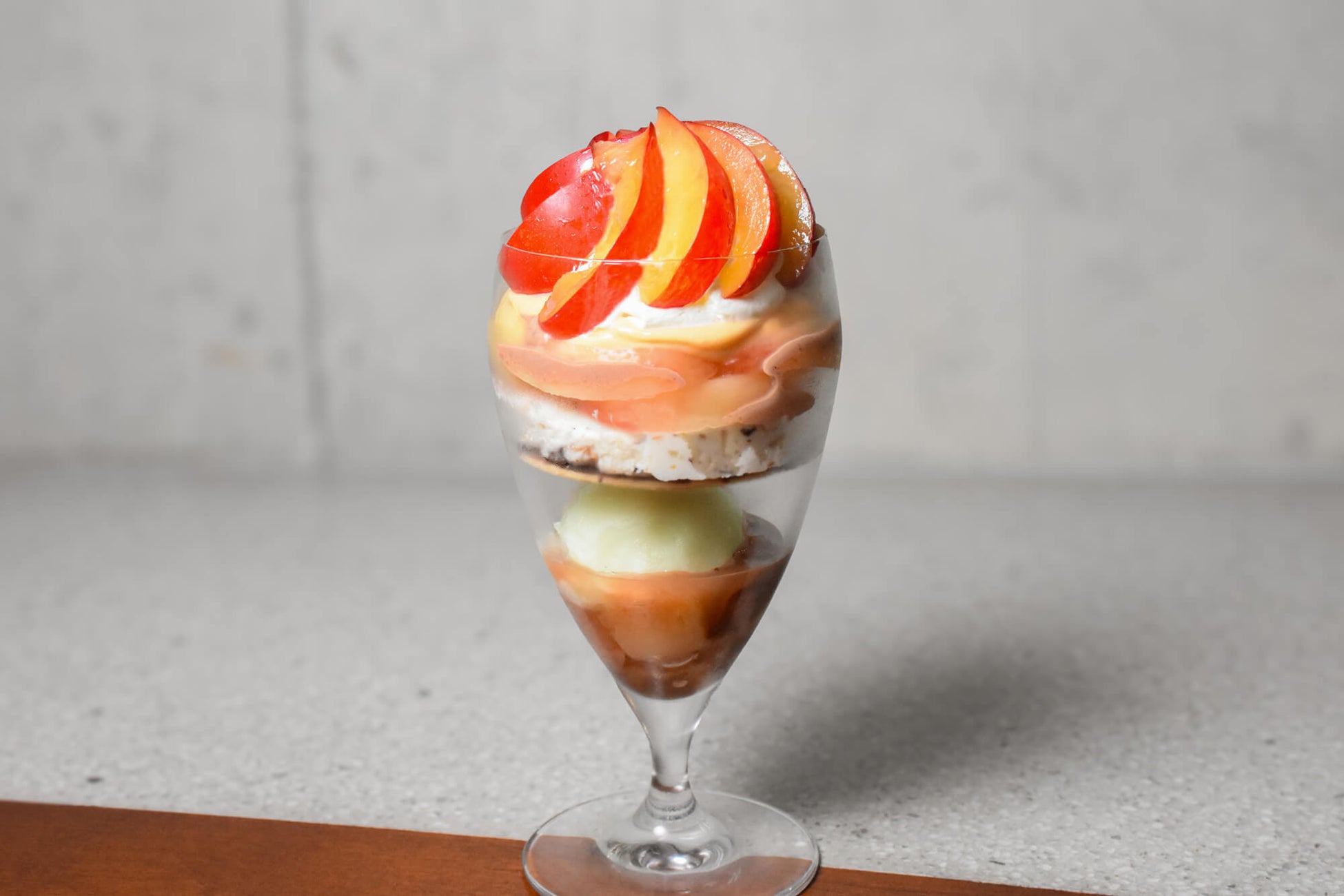 ジューシーな桃とチョコレートの相性を楽しみながら、移り変わる味わいを堪能する桃パフェ