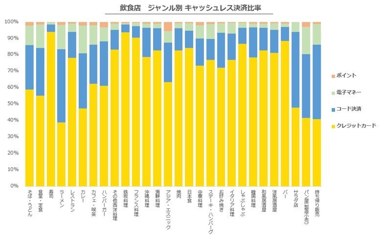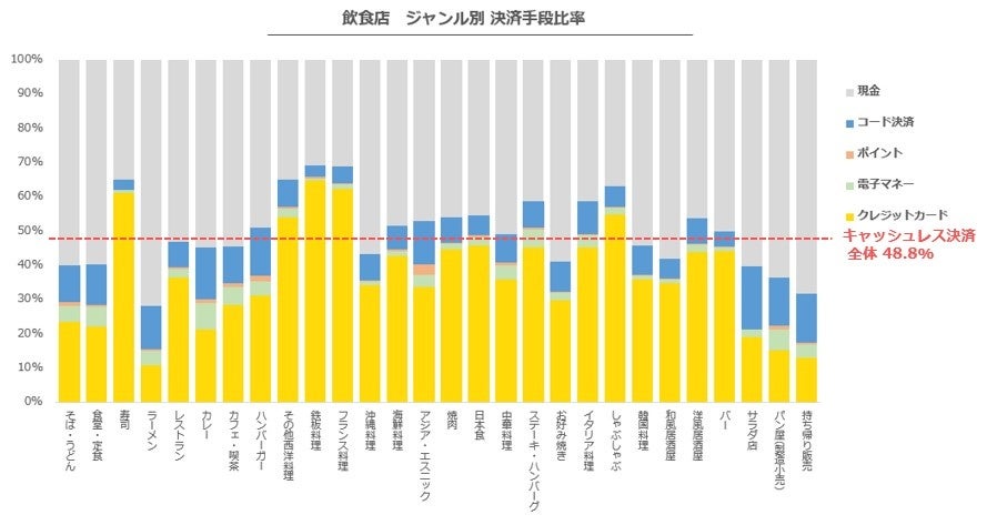 ジャンル別に見ると、寿司・その他西洋料理・鉄板料理・フランス料理・しゃぶしゃぶでキャッシュレス比率が60%を超える。また、コード決済比率が高いサラダ店とカレーでは、その比率が15%を超える。