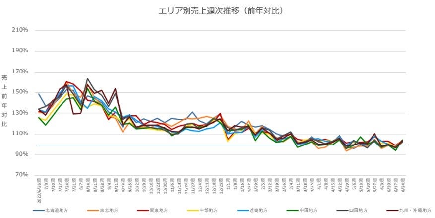 6月売上、前年対比の伸長率(地方平均)は99.8%と前月から2.2pt減少した。各地域の売り上げについては、関東地方・中部地方・近畿地方で前年対比100%を上回る。