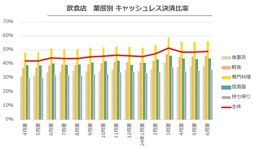 業態別で見ると、キャッシュレス決済利用は、1位の専門料理が50.5%で前月より0.6pt増加した。