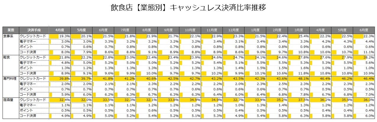 ・キャッシュレス決済手段別では、5月度から6月度で比較すると、すべての業態でコード決済比率が増加した。