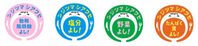 栄養素(たんぱく質、塩分、飽和脂肪酸)と野菜を適切摂取できるメニューであることを示す目印として、「ツジツマシアワセ」マークを表示します。これにより、栄養素について詳しく知らなくても、生活に取り入れやすいかたちで栄養バランスのツジツマあわせを実践できます。(マークは、「日本食品標準成分表(八訂)」食材の栄養素情報を使って判定されます。)