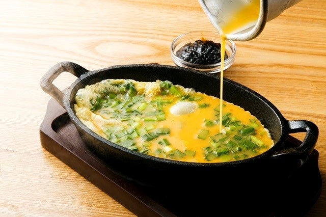 ▲アツアツの鉄板でお客様の前で卵液から焼き上げる「鶏だし玉子焼き」