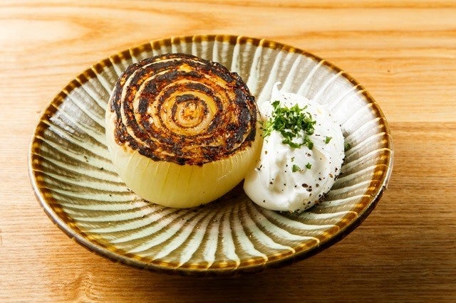 ▲野菜も佐賀直送の旬のものを取り入れています。「玉葱焼きサワークリーム」は、佐賀産の糖度の高い玉ねぎを炭火で香ばしく。サワークリームでいただきます