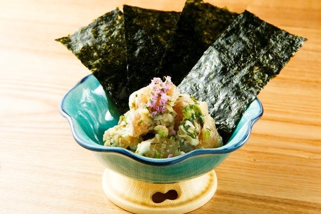 ▲通常は白身魚で作るなめろうを、「みつせ鶏」の新鮮な生のササミを使った「ササミ海苔なめろう」