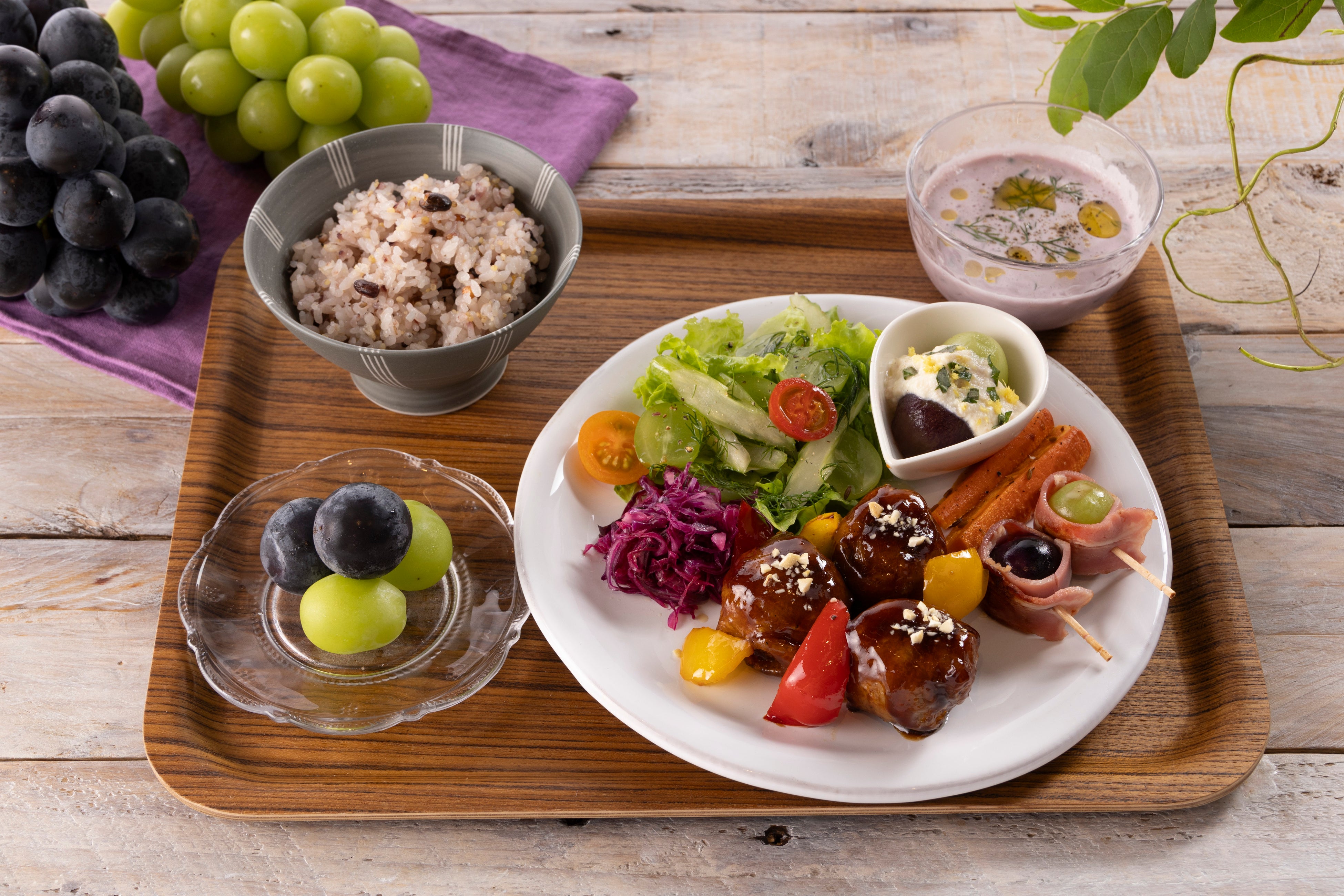 副菜 :シャインマスカットとセロリのサラダ、ぶどうの白和え、ぶどうのベーコン巻き