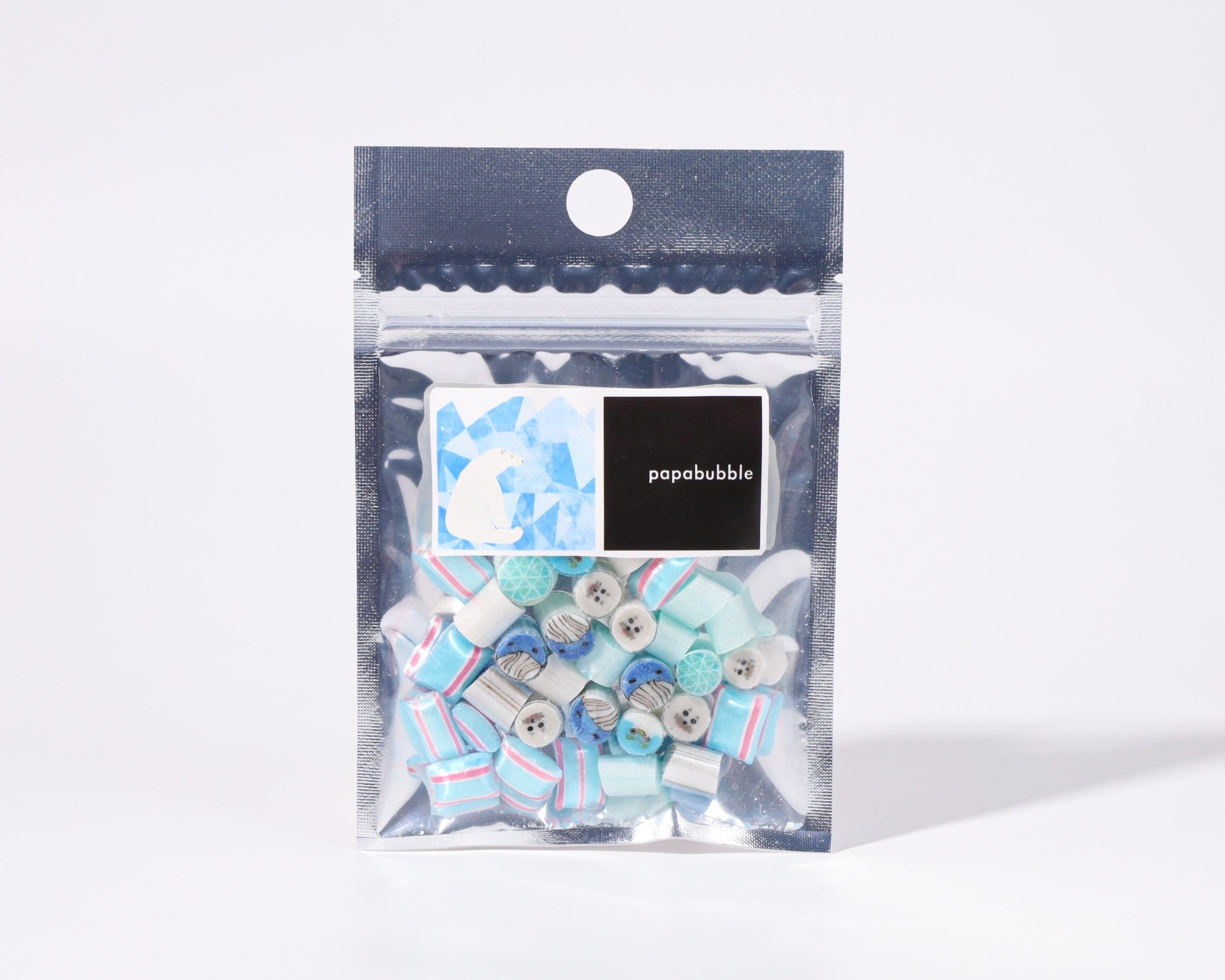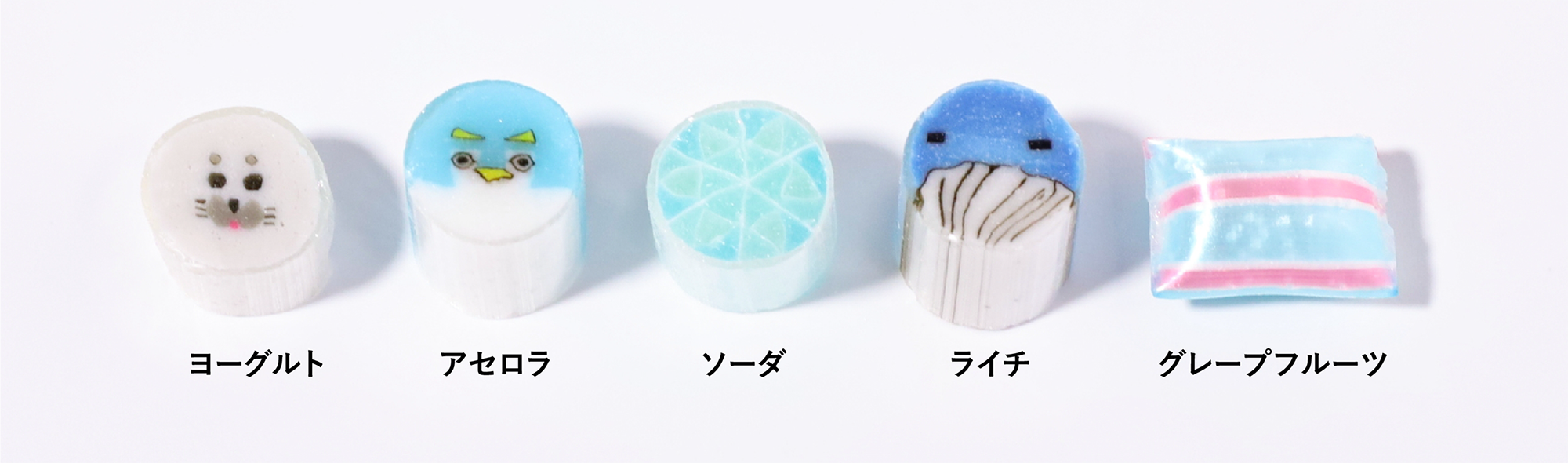 暑い夏に涼しくなるような、ひんやり動物が大集合です。氷をイメージしたキャンディは、光に透かすとキラキラ輝く涼しげ空間に。暑い季節にピッタリなアセロラ、ソーダ、グレープフルーツなどの爽やかなフレーバーで、目も舌もひんやりさせてください。