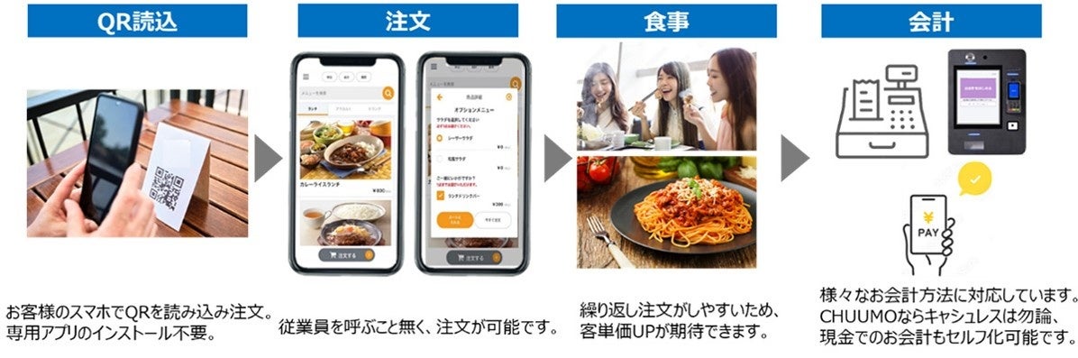 「CHUUMO」は、アプリのダウンロードやユーザー登録が不要で、QRコードをスマホで読み取り、来店客がセルフで飲食店での注文から会計までを済ませることが可能なサービスです。受注業務、会計業務をセルフ化することで、飲食店様における人手不足の解消に寄与します。来店客のスマートフォンでのキャッシュレス決済に対応の他、インバウンドにも対応しております。また、マミヤ・オーピーグループの経営基盤を活かした手厚いサポート体制が整っており、全国に保守拠点、365日対応可能な自社コールセンターを構えております。