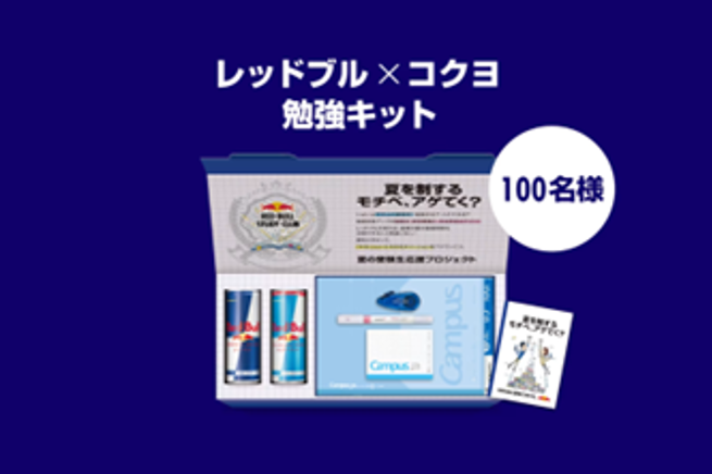 本キャンペーンでは、CCC カルチュア・コンビニエンス・クラブ株式会社が運営する「SHARE LOUNGE Olive LOUNGE 渋谷」とコラボレーションし、8月26日(月)~28日(水)の期間限定で、早朝から使える「Red Bull Study Club presents『超集中自習室』」の1 Day Passを1日7名様にプレゼント(3日分:計21名分)。また、受験生のモチベーションをアップさせるレッドブルとコクヨとの特別コラボレーション勉強キットを100名様にプレゼントする、XでのWフォローキャンペーンとなっております。