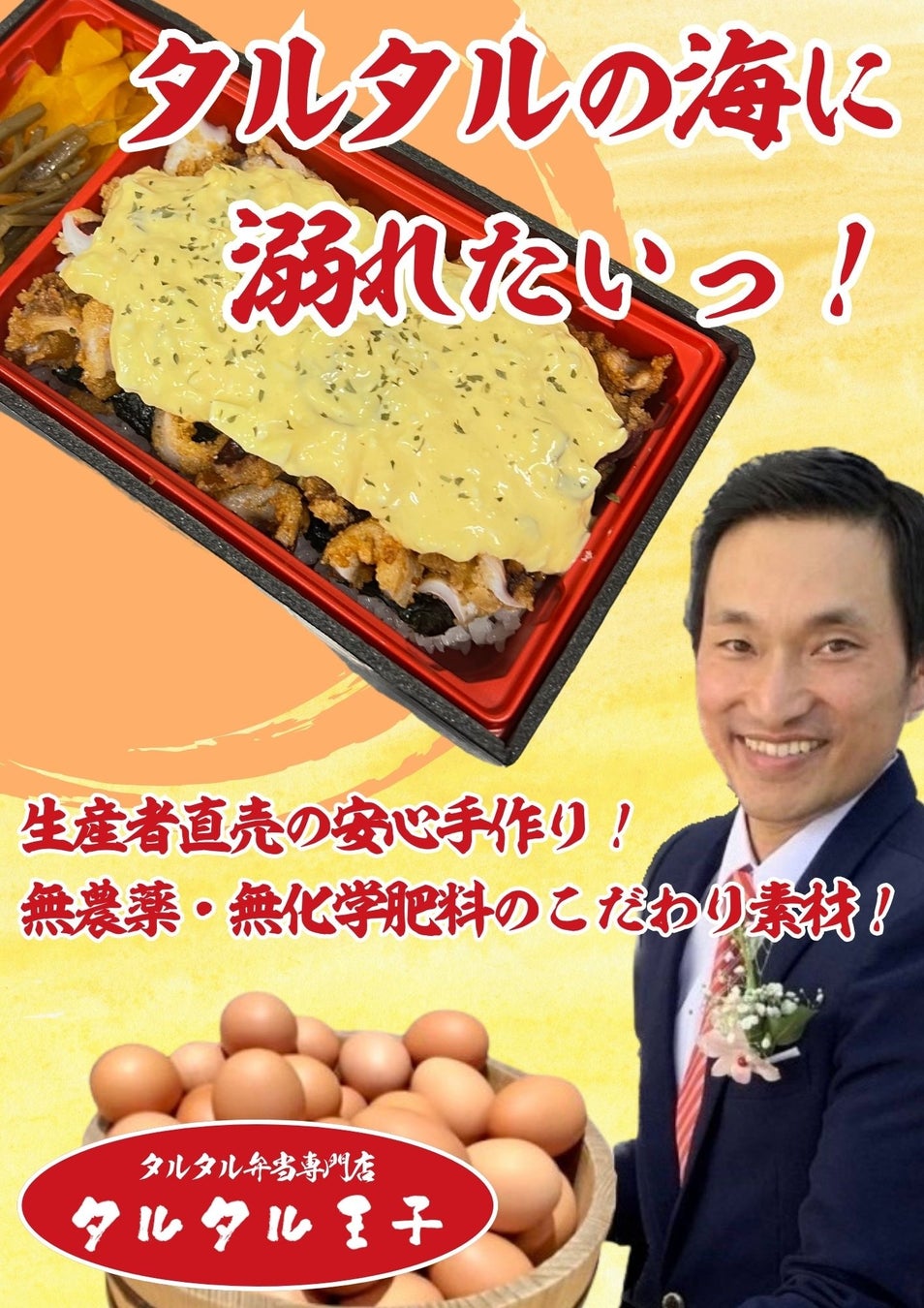 お子様からご年配まで老若男女から圧倒的な支持を得ている魔法のソース「タルタルソース」。「タルタル王子」では、農薬・化学肥料不使用の地卵を使用し、安心安全の手作りにこだわったオリジナルの「タルタルソース」を、オーソドックスな「海苔タル弁当」のみならず、「いか唐揚げ」の上に海のようにたっぷりとかけた中毒性抜群の旨さがウリの福岡ソウルフード、某テレビ番組でも話題となった「いかタル弁当」などを販売しています。