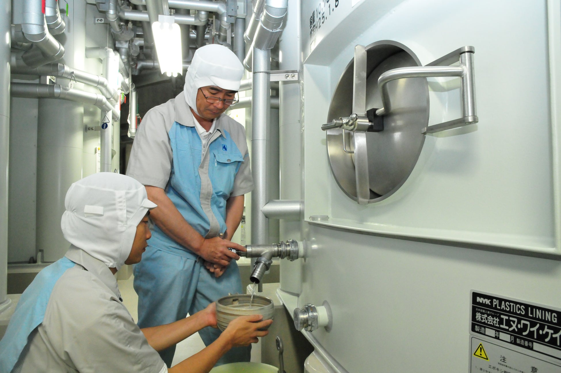 「初呑切り(はつのみきり)」とは、貯蔵タンク内の清酒が健全に貯蔵されているか調べるために、貯蔵タンクの呑口(のみぐち)から少量の酒を取り出し分析を行い、熟成度合い、味、色の変化を確認する酒蔵ならではの伝統行事です。杜氏が、貯蔵タンクの呑口(のみぐち)から少量の酒を取り出し、香りや味わいを吟味し、その後の貯蔵管理の参考にすることから日本酒の「健康診断」とも考えられ、酒造りと同様に貯蔵も重要な管理の一つです。杜氏や蔵人は自分達が仕込んだ酒が無事に熟成しているかどうか、貯蔵してから初めて確認する日でもあります。緊張感に溢れ、ほっと胸をなでおろす瞬間です。
