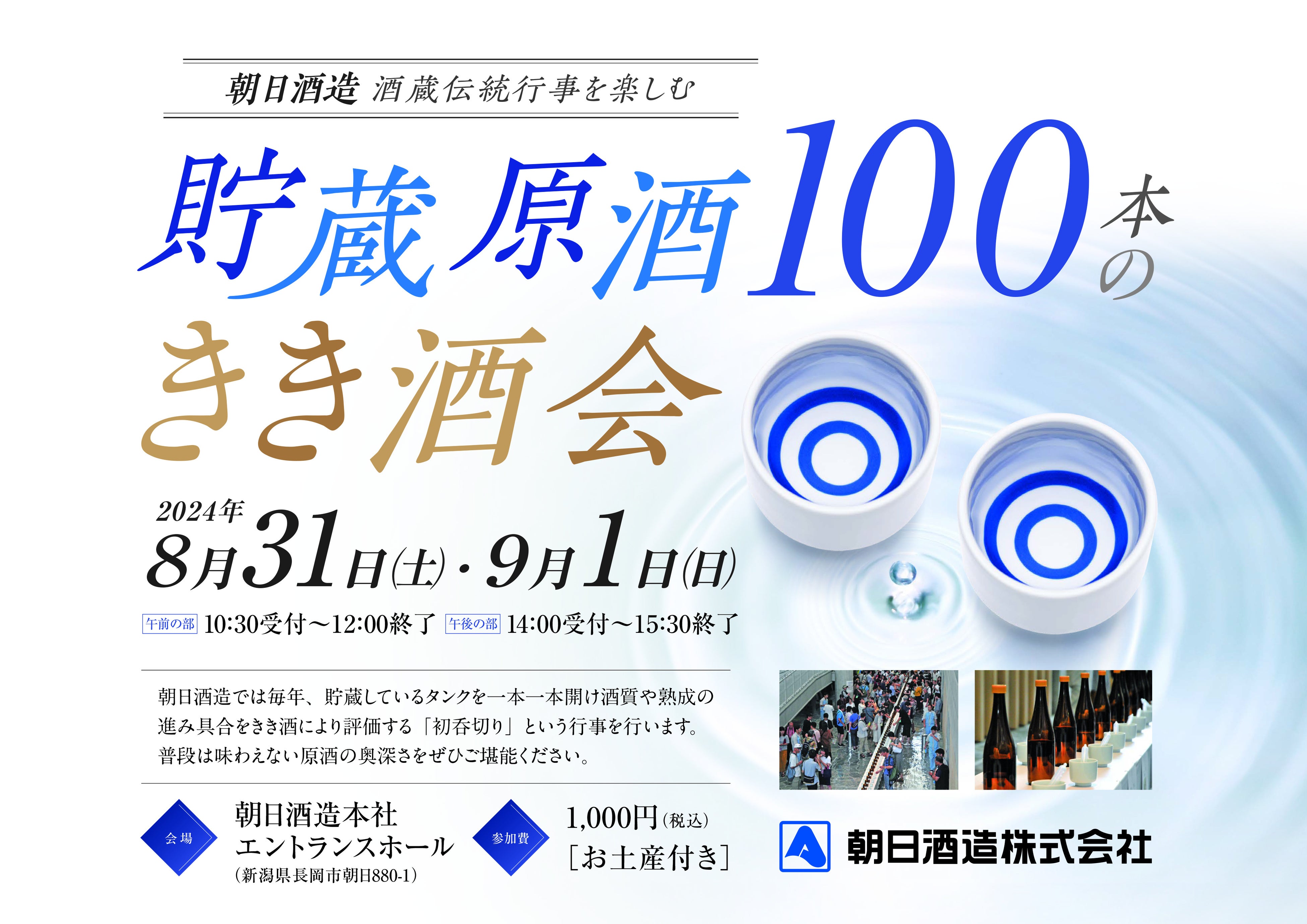 朝日酒造株式会社(本社:新潟県長岡市、代表取締役社長:細田 康)は、日本酒を貯蔵しているタンクから少量の酒を取り出し分析を行い、酒質や熟成の進み具合をきき酒により評価する「初呑切り(はつのみきり)」を毎年夏に行っております。酒蔵ならではの伝統行事を一般のお客様にもご体感いただき、普段は味わえない原酒の奥深さを味わっていただくために、「貯蔵原酒100本のきき酒会」を朝日酒造エントランスホールで8月31日(土)から9月1日(日)の2日間限定で開催いたします。