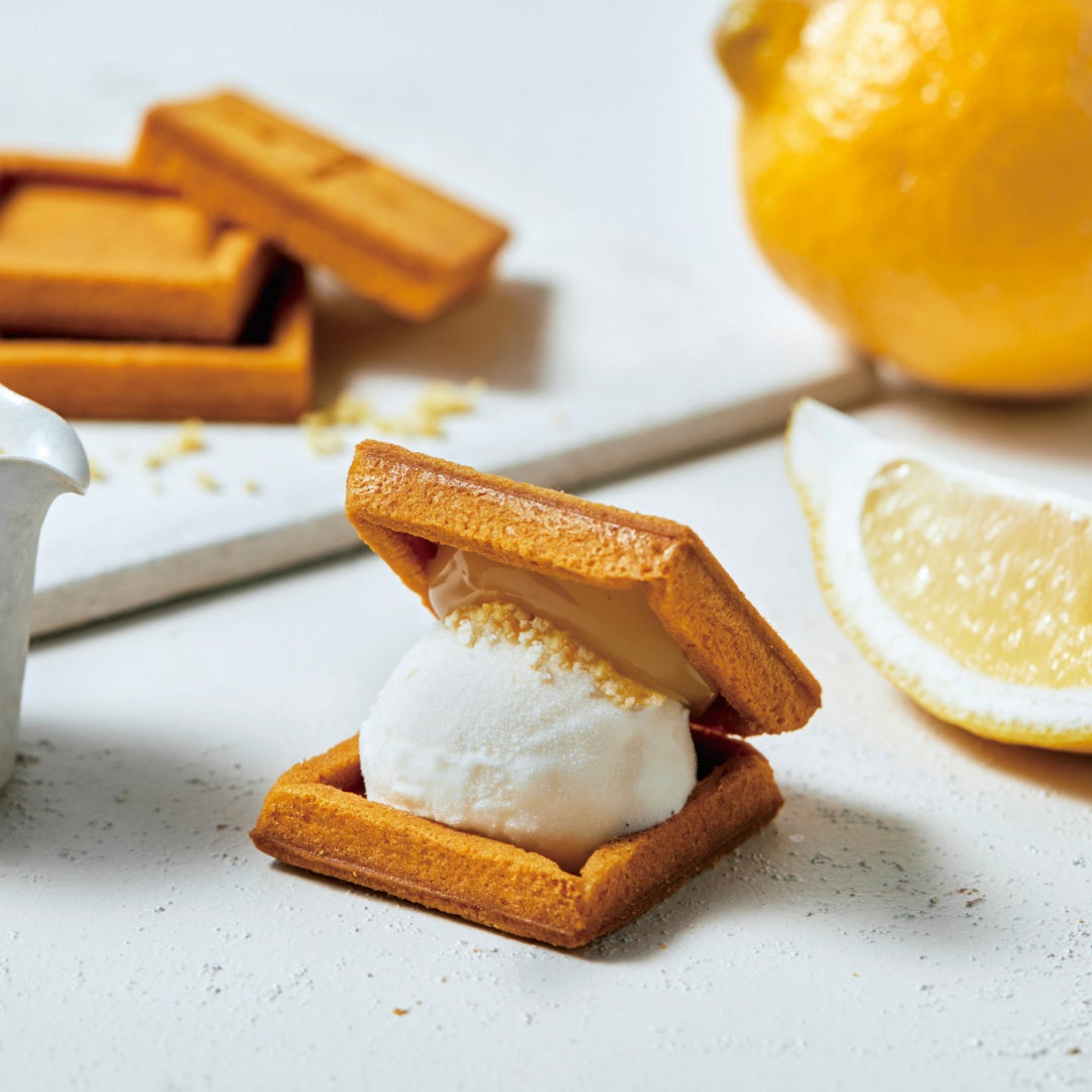 刻んだレモンの皮をトッピングしたバニラビーンズ入りのアイスと、果汁たっぷりのレモンバターキャラメルを、店舗で焼き上げたサクサクのレモンクッキーでサンドしたアイスサンドです。使用するレモンは全て瀬戸内産のものに限定し、爽やかな酸味とひんやりと甘いバニラアイスのバランスが絶妙の、暑い夏にぴったりの商品です。
