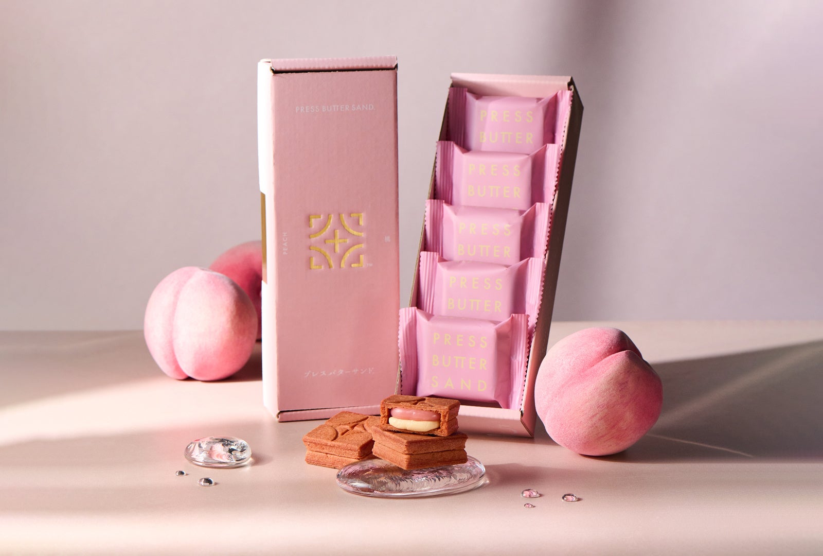 桃ガナッシュと、果肉感のある桃ジャムを練り込んだミルキーでコク深い桃バタークリームをサクサク食感のクッキー生地で挟みました。かじった瞬間にガナッシュの濃厚さと甘酸っぱさ、バタークリームのやさしい甘さがとろりとあふれ出し、桃そのものを食べているような凝縮した味わいが口いっぱいに広がります。