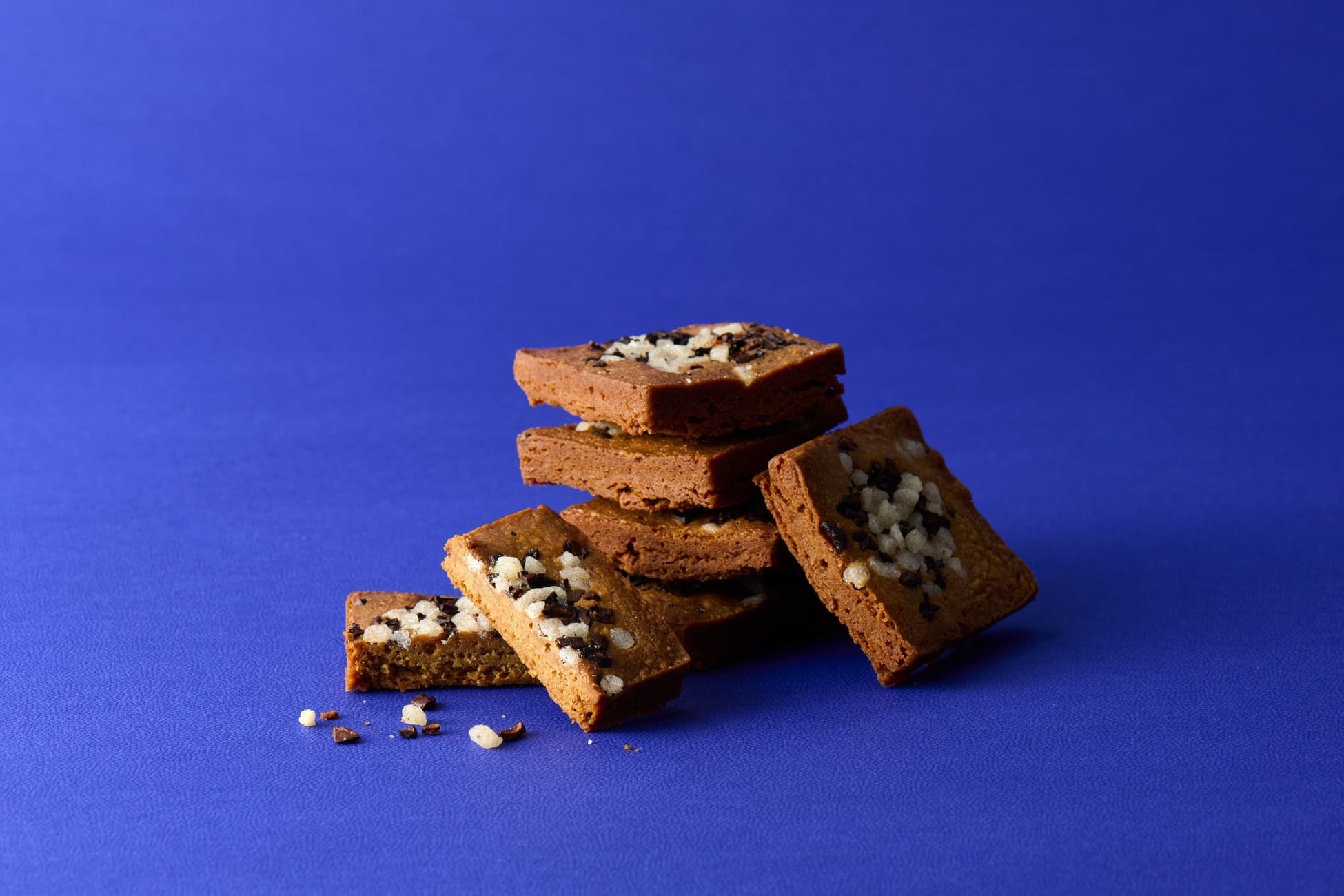 北海道産の小麦粉とバターに、ナッティな風味のチョコレートを使って、濃厚でほんのりビターに仕上げました。ザクザクとした食感のカカオニブがほろ苦く、多彩な食感と味わいが詰まっています。