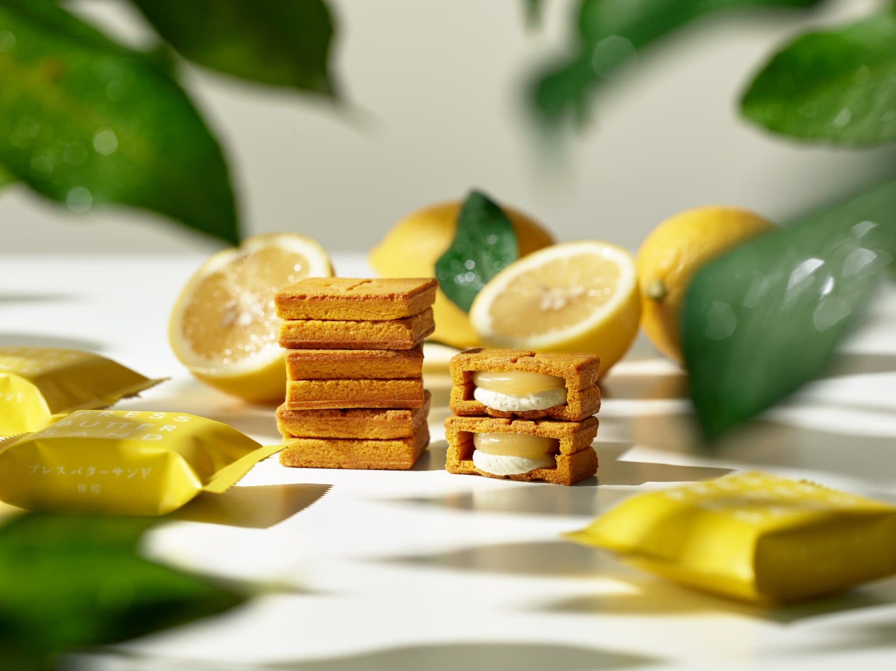 瀬戸内産レモンを贅沢に使用したバターサンドです。バタークリームには皮を細かく刻んだレモンゼストを、バターキャラメルには果汁をペースト状にしたレモンカードを加え、レモンピールパウダーを練り込んだクッキー生地で挟みました。果汁から皮まで余すことなく素材を使い、食べた瞬間にレモンをまるごと感じていただけます。