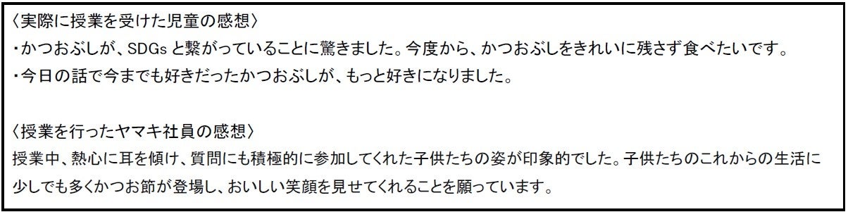 ヤマキは、かつお節の価値・魅力を広める活動の一環として、今後も教育機関と連携し、食育授業を継続して行ってまいります。