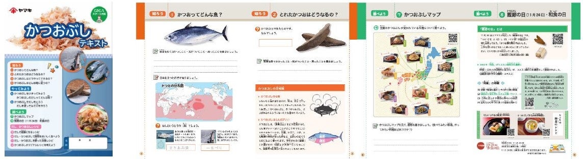 『かつお節特別授業』で使用するテキストは、ヤマキが協力し、「かつおぶし食育研究会」によって制作された、書き込み可能な学習テキストです。「知ろう」「やってみよう」「調べよう」「だし、かつおぶしレシピ」の4つのパートに分かれており、二次元バーコードを使用して、かつお節の作り方から削り方、かつお節を使った日本各地の料理を紹介する「かつおぶしマップ」、かつお節・だしを使用したレシピまで、これ1冊でかつお節について詳しく学ぶことができる内容になっています。