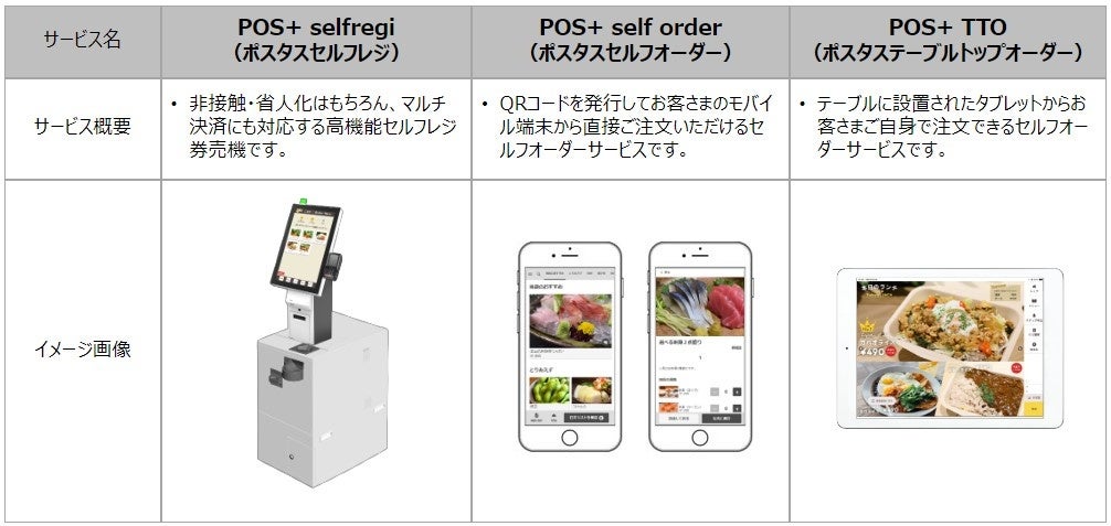 「POS+」は、店舗の売上向上や店舗運営担当者の業務負担軽減による生産性向上を実現し、また従業員にとって 利便性の高い機能を搭載する店舗向けソリューションです。飲食店向け「POS+ food」や小売業向け「POS+ retail」、理美容向け「POS+ beauty」、クリニック向けの「POS+ healthcare」のクラウド型モバイルPOSレジをはじめ、セルフレジ・券売機「POS+ selfregi」、モバイルセルフオーダーサービス「POS+ self order」、テーブルトップオーダーサービス「POS+ TTO」などの様々なソリューションで、効率的な店舗運営を支援いたします。