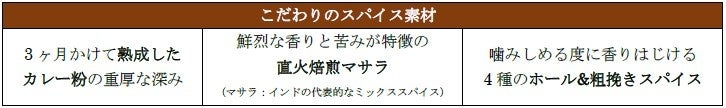 掛け合わせました。「スパイスの芳ばしさ」にこだわり、スパイス素材の味わい、香り、食感を楽しめ
