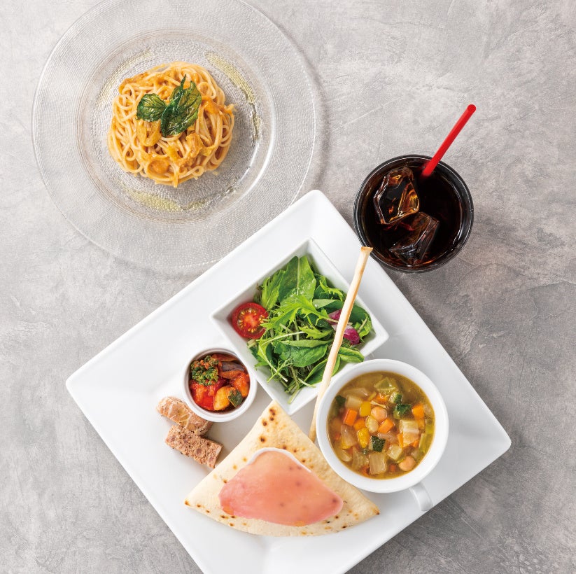 「雲丹の冷製スパゲッティ」は、前菜プレートやドリンクとご一緒に手ごろな価格で楽しめる「季節のピアットウニコ」をご用意しております。