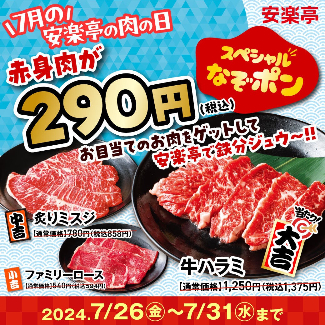 いよいよ夏、本番!7月の「安楽亭の肉の日」は、牛ハラミ・炙りミスジ・ファミリーロースを肉の日特別価格290円(税込)でご用意して、暑~い日もがんばるみなさまに、夏バテ予防に赤身肉で鉄分ジュウ~していただきます!