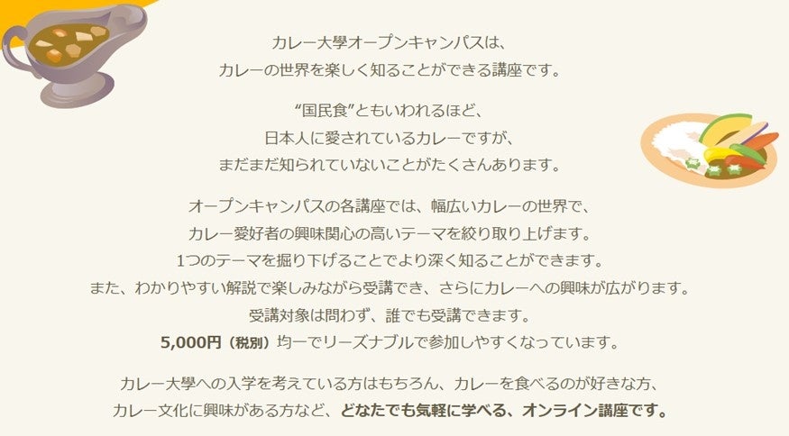 受講対象は問いません。カレー大學への入学を考えている方はもちろん、カレーを食べるのが好きな方、カレー文化に興味がある方など、どなたでも気軽に学べる、オンライン講座です。