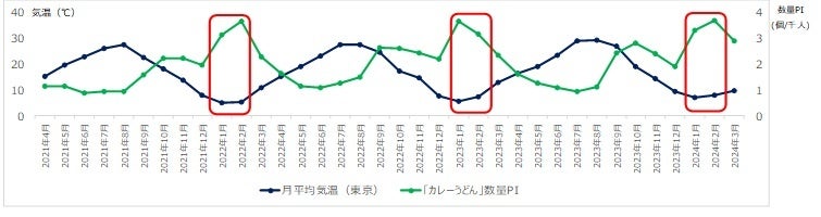一般のスーパーマーケットにおけるカレーうどん(冷凍・カップ麺およびカレーうどんの素類)は通年販売されていますが、その需要は下図(*)のように「9月頃から徐々に高まり、1~2月にピークを迎える」ことが顕著にみられます。また、東京を例に取ると1~2月は月の平均気温が最も下がる時期ですが、同時期に需要が頂点となることからも、“寒さの底”と密接にリンクし、カレーうどんが”暖を取る”メニューとして定着していることがよくわかります。