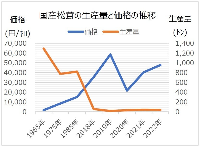 秋の味覚の代表格である松茸ですが、農林水産省のデータ(*1)によると松茸の価格は高騰を続け、国内生産量は年々減少しており、喫食の機会が減っていることがうかがえます。