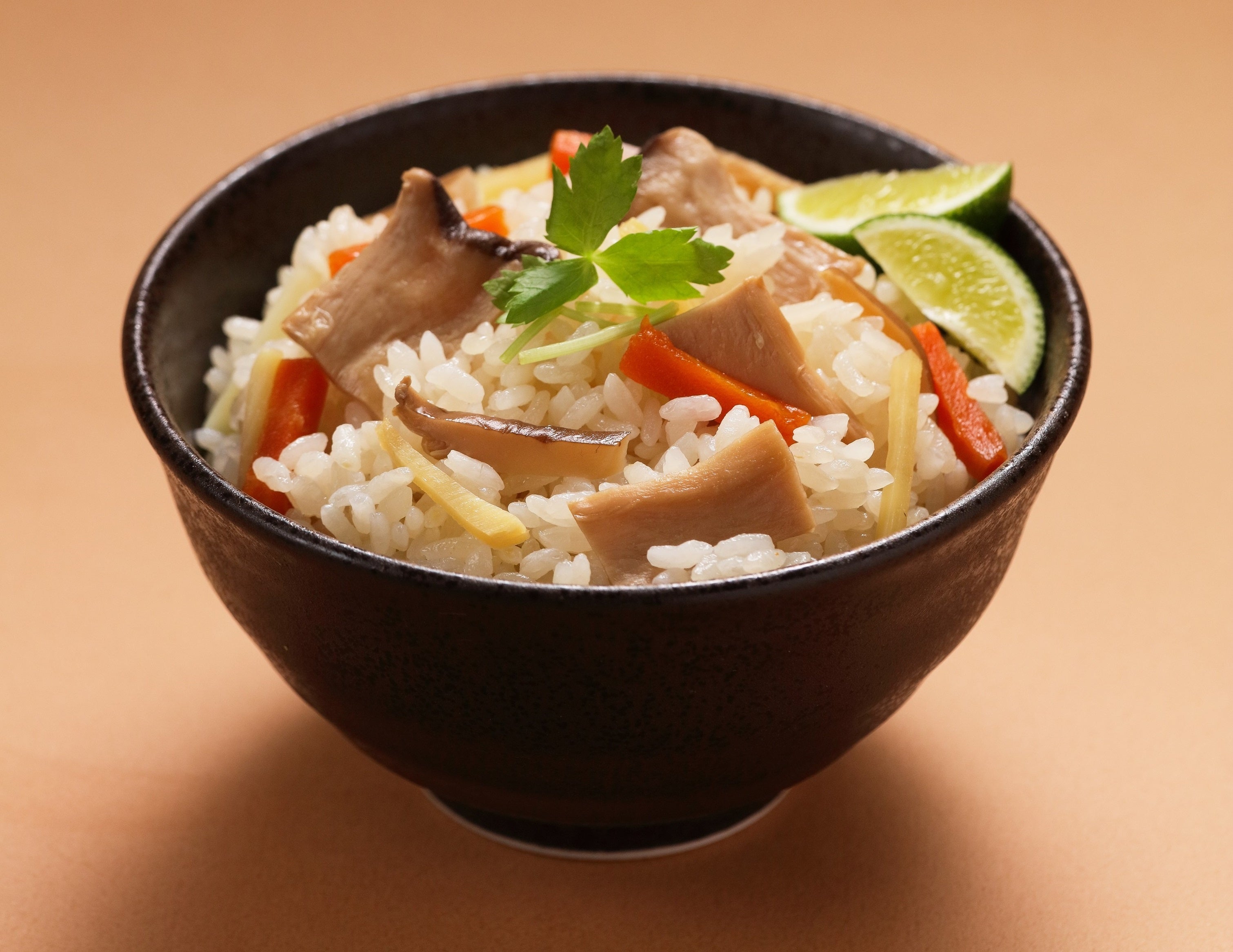 エリンギ、ひらたけ、たけのこ、にんじんの4種の具材入りです。カットにこだわったエリンギを最も多く配合し、具材感、食感とも満足できる仕上がりです。松茸の風味にヤマモリ独自の5種の国産素材を使った旨みだしを使用することで松茸の香りを感じつつ、旨みが詰まった炊き込みごはんをお楽しみいただけます。