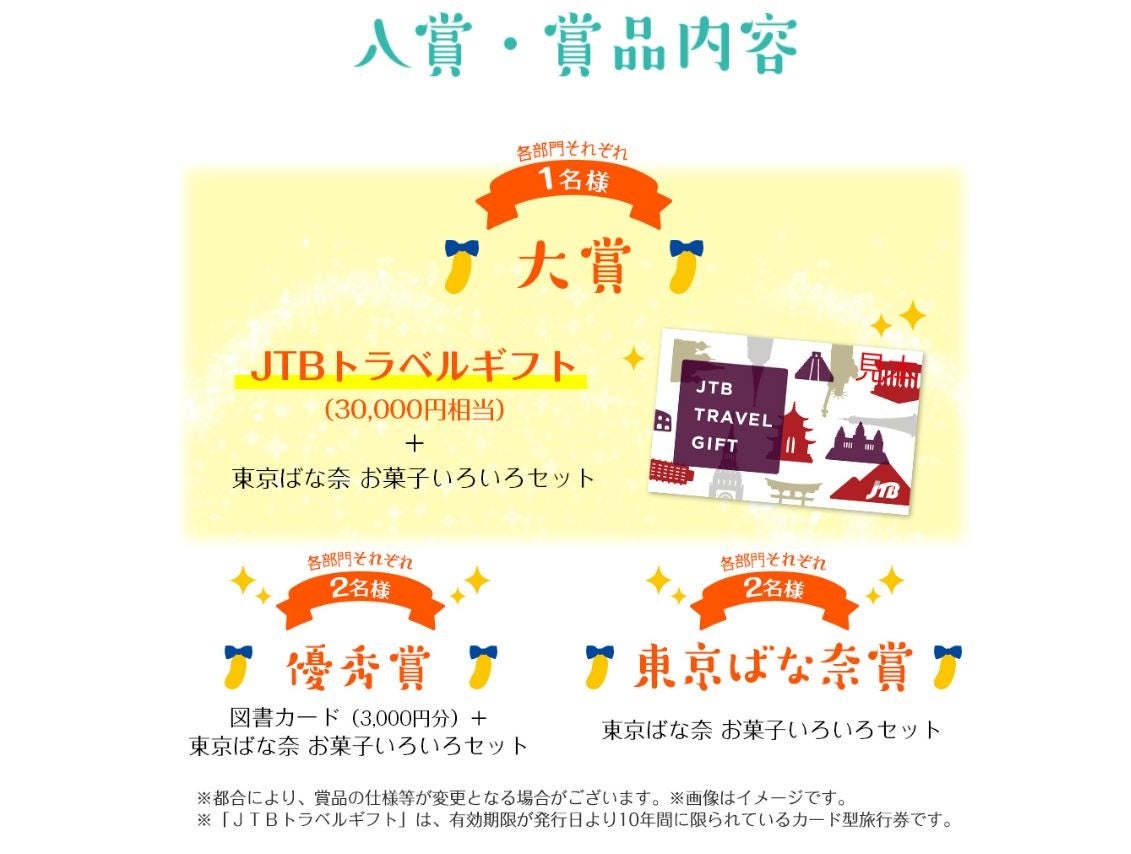 ①大賞(各部門それぞれ1名様):「JTBトラベルギフト」(30,000円相当)+東ばな奈 お菓子いろいろセット