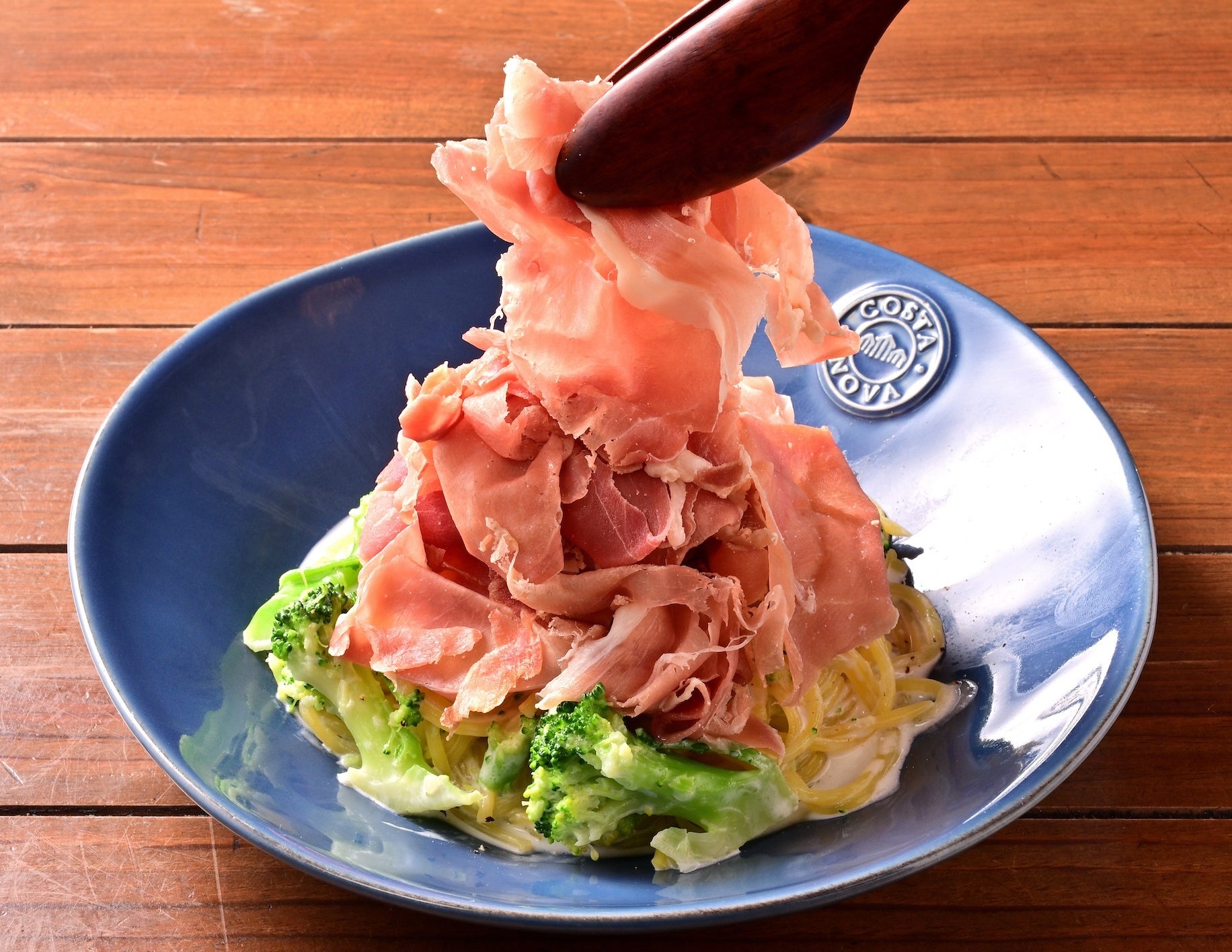 なめらかなクリームソースに、スペイン産の生ハム、ハモンセラーノをお好きなだけのせられる贅沢さがたまりません。生ハムの塩気とクリームのまろやかさが絶妙にマッチし、どんどん積み重なる生ハムの美しさはまさに圧巻です。余った生ハムはお酒のお供にも最適!生ハム好きにはたまらない一皿をお楽しみください。