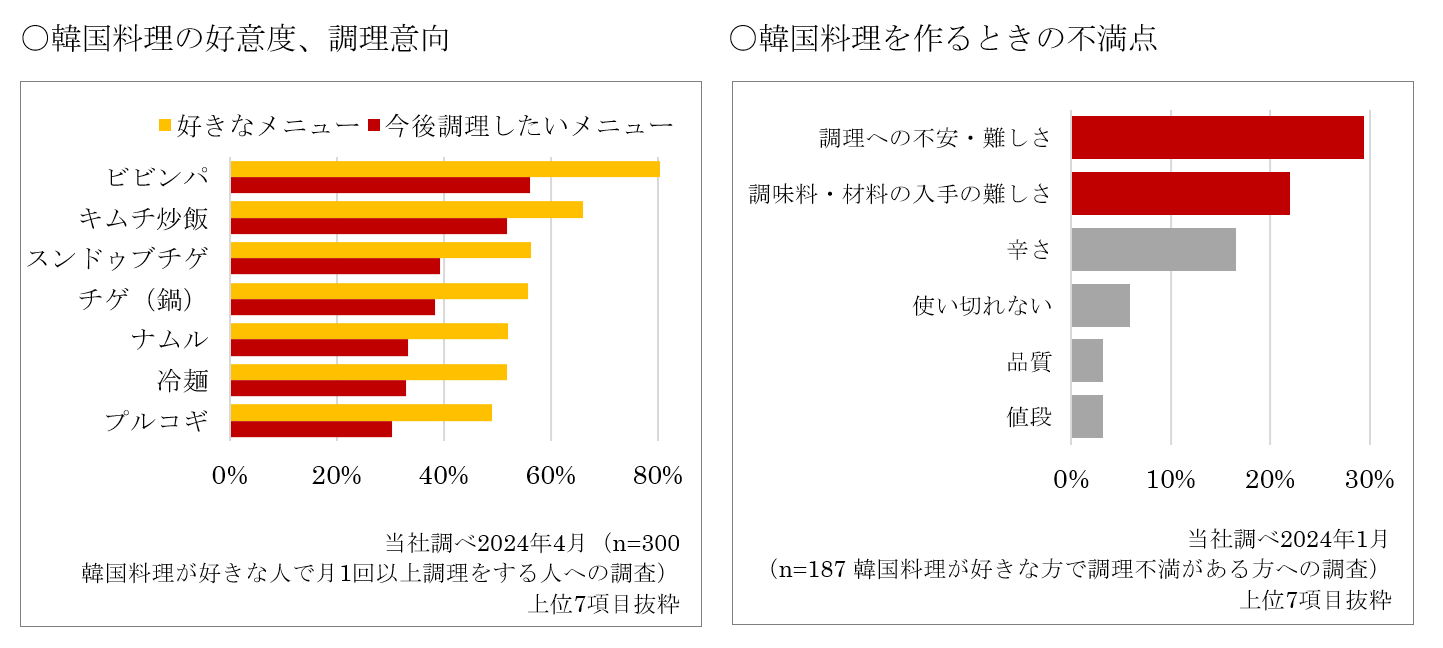 一方、家庭で韓国料理を作る際には、普段使用しない調味料の準備や味付けの難しさにハードルを感じていることがうかがえます。