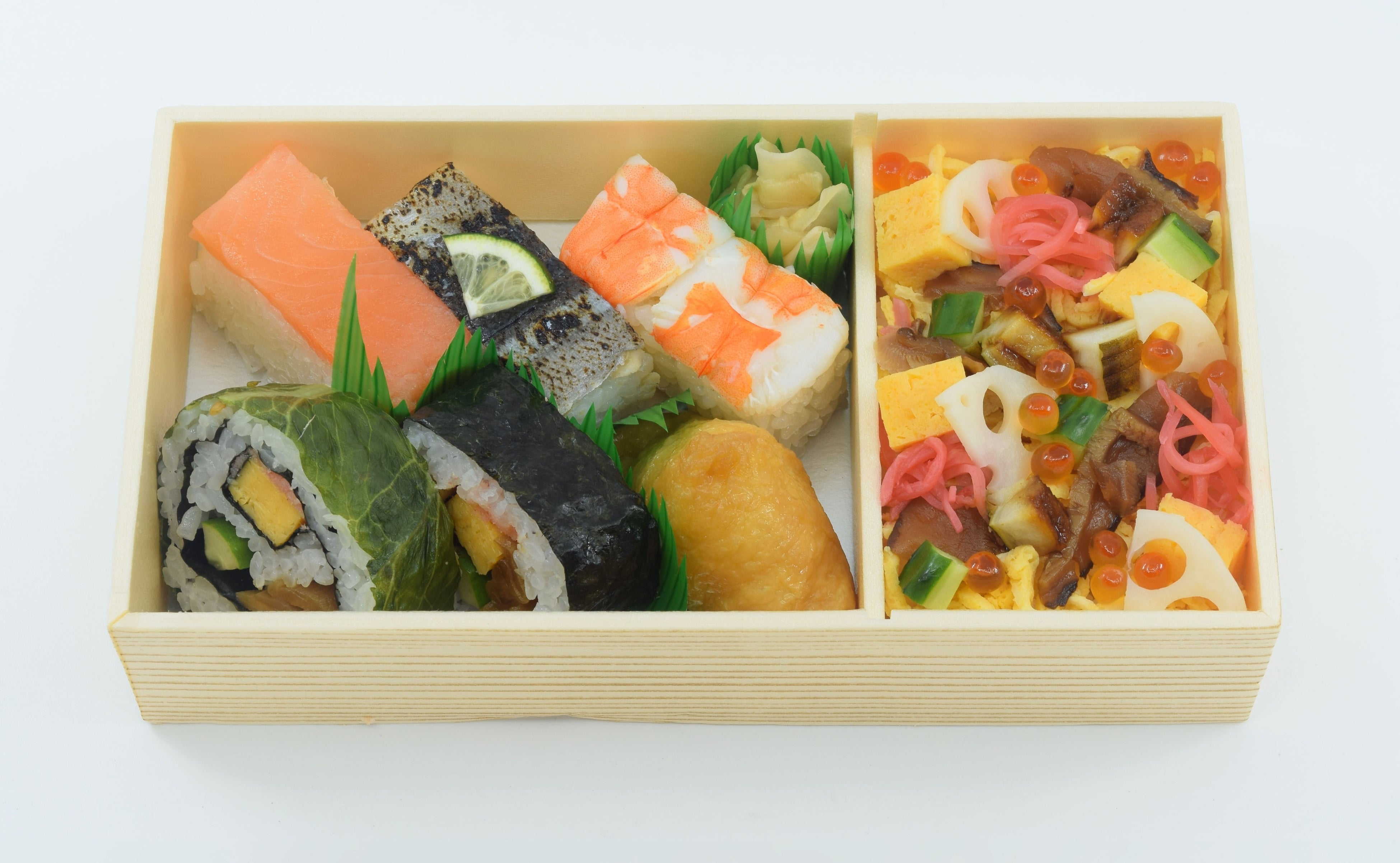 ◯具材内容:穴子といくらのちらし寿司、押寿司(炙り〆さんま、サーモン、海老)、