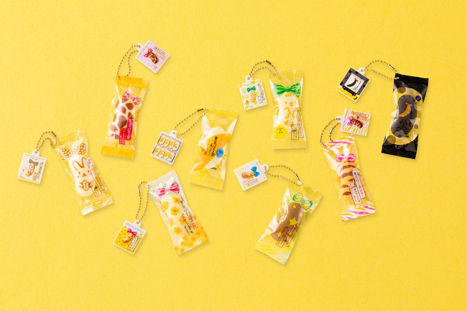 『東京ばな奈 スクイーズマスコット』は、その可愛らしいパッケージをはじめ、バナナの曲線をイメージさせるふっくらとしたスポンジの触り心地に至るまでをミニチュアサイズで再現したマスコットです。「Part2」では定番の「東京ばな奈」と個性豊かな7種類の歴代登場ばな奈も登場。パッケージ箱がプリントされたプレートも付属しています。大好きなばな奈や、思い出のばな奈など、お気に入りの“マイばな奈”をお楽しみください。