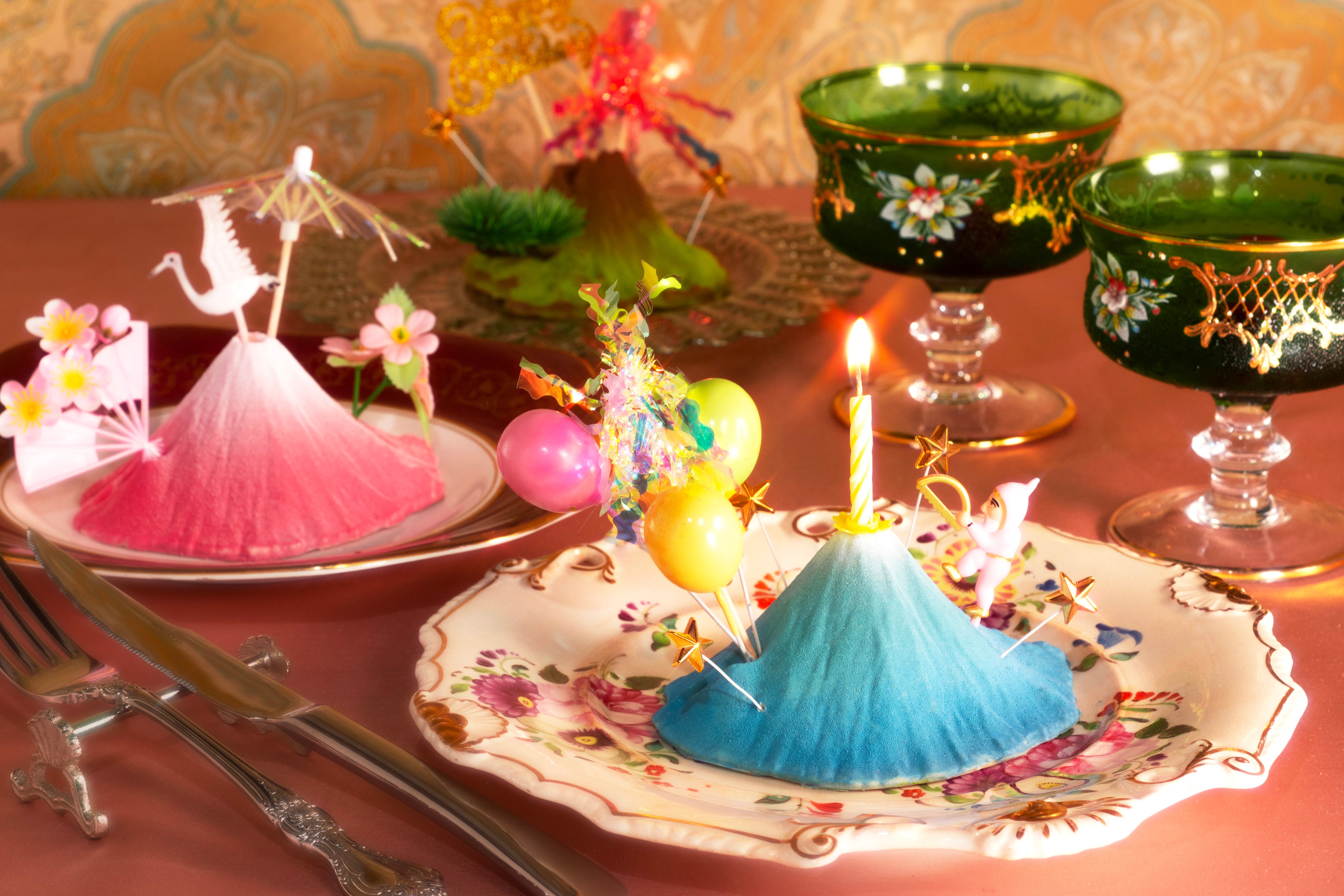 お好きな山菓子をお選びいただき、世界各国の様々なヴィンテージのお皿などから、お好きなお皿を選択、更に30種類以上あるデコレーションピックからお好きな組み合わせを選んだら、スタッフがお山におつけしてご提供いたします。