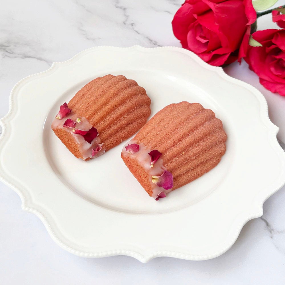 ブルガリア産ダマスクローズのみを使用し手摘みされた新鮮なバラの花弁を用いて水蒸気蒸留にて製造している、USDAオーガニック認証のローズウォーターを生地に加えています。さらに化学農薬不使用で栽培した食用バラを生地に加え、最大限ローズを堪能できるようにしました。トッピングにも同じものを使用しています。ピンク色の生地はビーツパウダーで色付けしました。ローズの香りはしっかりと感じられますがくどくならないように配合を調整しております。