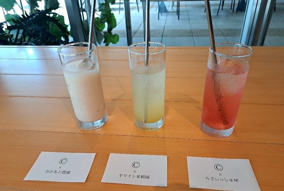 マッチング会に初参加した村松農園は「ドライのトウモロコシは使い方を明確にできないまま作ったが、おいしくしていただいた。ペーストは思いつきもしなかった。勉強になりました」、ヤマイシ果樹園は「名前もかわいいが、この暑い中で働いて、外で作業してるときに飲みたい一杯」と語りました。提供は8月1日~31日。