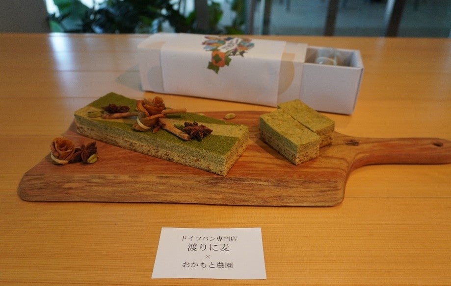 続いて、ドイツパン専門店「渡りに麦」(牟呂町)は、豊橋の特産品次郎柿とコラボし、ドイツの伝統菓子であるバウムクーヘンを作りました。豊橋の魅力が詰まった土産にするため、通年で作れるように次郎柿の葉と皮を使っています。「すごく糖度があるし、栄養もある」と言う柿の皮はドライにして使用。「柿の糖度を利用したことで実質40%ほど、いつものバームクーヘンに比べて、砂糖を減らして作ることができました」と説明しました。葉の美しい緑色を生かすため、粉とペーストを混ぜ込み、2層のバームクーヘンになっています。「本来いらない、 使わなくなったものもあえて拾って役目を与えてあげたい。ここにクローズアップしたいと思い、皮と葉っぱを選びました」と開発のこだわりを語りました。