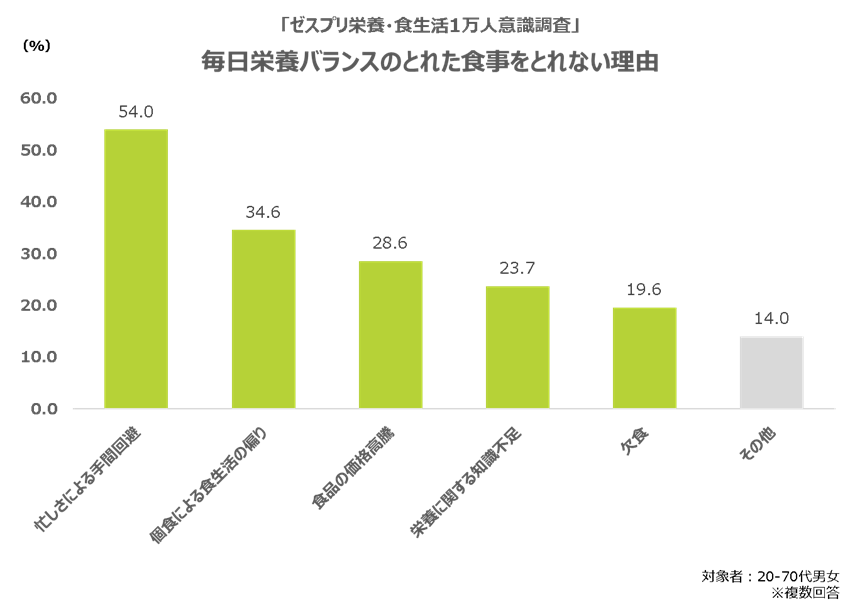 健康そうなイメージがある日本。しかし、厚生労働省の調査によると、日本の成人の3人に1人が「栄養不良」だそうです。実際、ほとんどの人が栄養バランスのとれた健康的な食生活を送りたいと思っているものの、さまざまな要因で諦めたり、継続できずにいることが「ゼスプリ栄養・食生活1万人意識調査」でもあきらかになりました。その理由としては、忙しさからつい食事を抜いてしまう、手間のかからないものを選ぶ、ひとりごはんだから簡単なもので済ませる、どんな栄養・食事をとるべきかが分からない、などです。