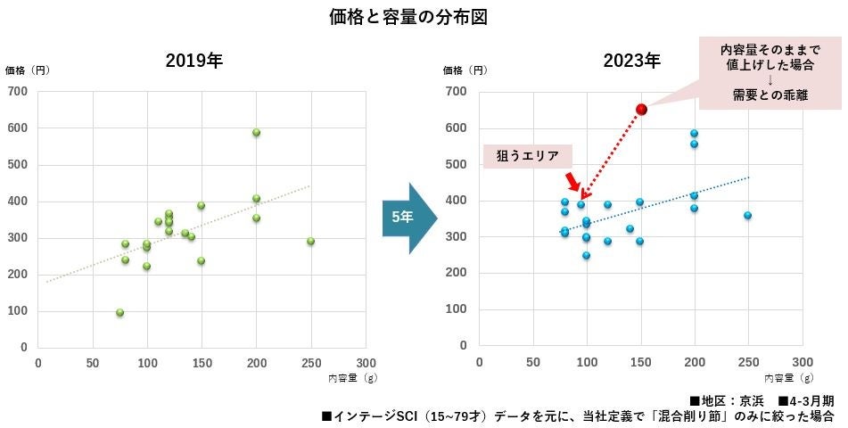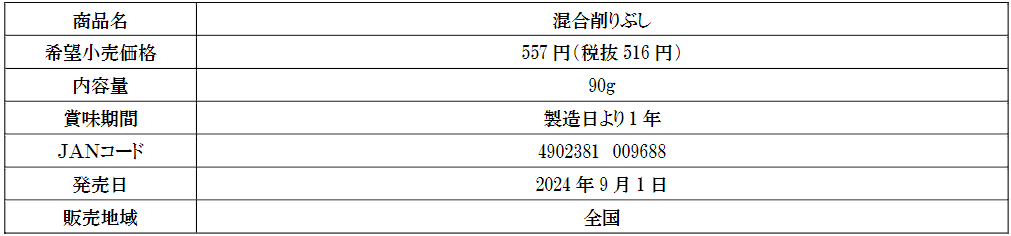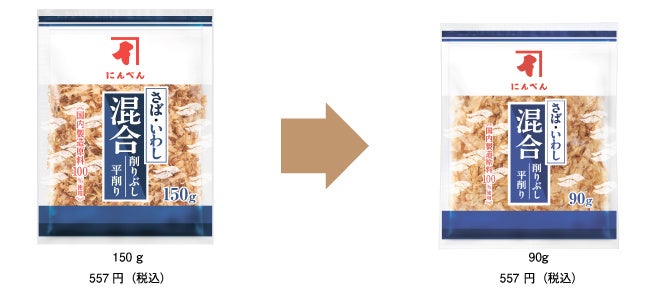 2008年の「混合削りぶし150g」発売以降、値上げの実績は無い中で、原材料費は153%ほど上昇しています。また、市場ニーズにも変化が起こり2023年は 100g前後、300~400円の商品が主流となっている背景を踏まえ、単純な値上げではなく市場に需要のある容量と価格帯に変更いたしました。内容量は150gから90gになり、より使いやすいかたちでご提供いたします。