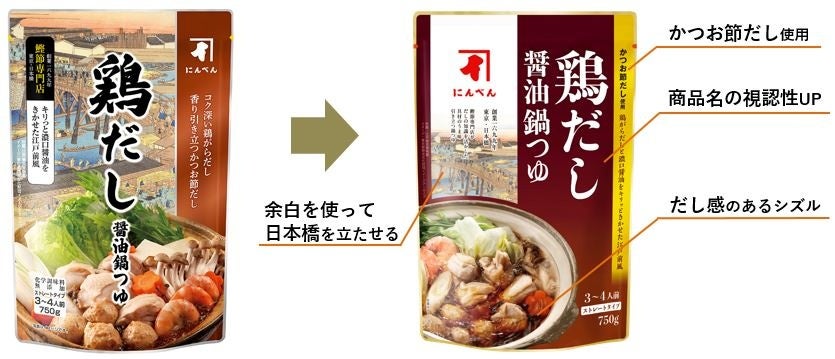 小売店バイヤーやアンバサダーへのアンケート、社内の営業担当者の意見から、「味がわかりにくい」「全体的に茶色く棚に並んだ時に日本橋のイラストがわかりにくい」などの課題が見えました。そこで、お客様にとって味がイメージしやすく、店頭で気づいてもらいやすいパッケージにリニューアルしました。