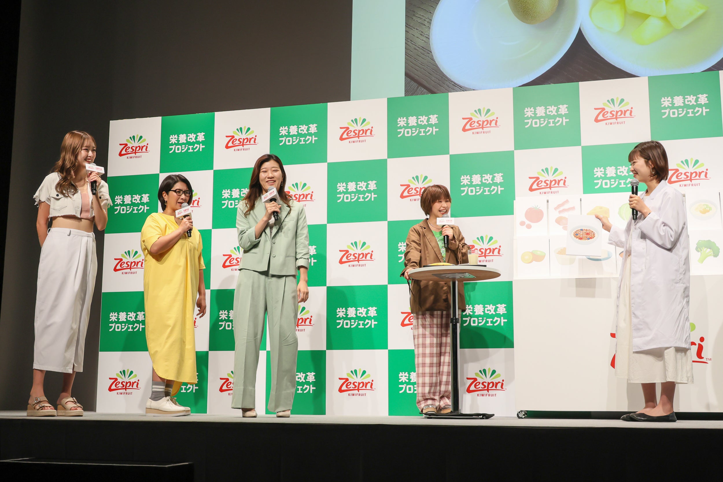 本プロジェクトの本格スタートに先駆け、「ゼスプリ栄養改革プロジェクト&新CM発表会」を2024年7月29日(月)、スパイラルホール(東京都港区)にて開催しました。当日は、くわばた りえさん、Aマッソ・加納さん、ヒコロヒーさん、ゆうちゃみさんをお招きしてトークショーを行いました。