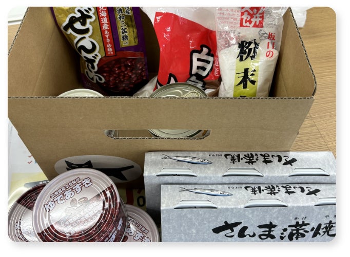 お菓子(チョコレート・クッキー・グミなど)、インスタント食品(うどん・ラーメン・焼きそばなど)、レトルト食品(カレー・雑炊・五目ごはんなど)、缶詰(あずき缶・鯖缶など)、飲料(缶コーヒー・お茶・野菜ジュースなど)