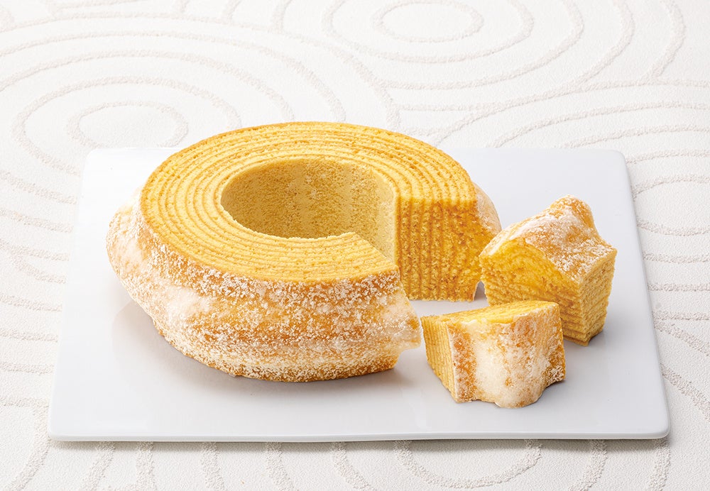 ねんりん家の誇る⼆⼤バームクーヘンのひとつ「ストレートバーム やわらか芽」。⽇本の味覚にふさわしい柔らかさを⽬指し、たっぷりの卵を贅沢に使ってふっくらとジューシーに焼きあげました。